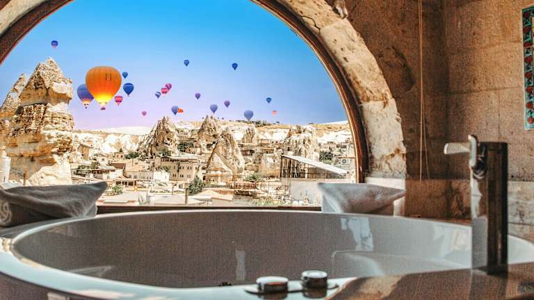 Das Erenbey Cave Hotel in Göreme bietet seinen Gästen ein einzigartiges Erlebnis in Höhlenzimmern mit modernen Annehmlichkeiten. Das familiengeführte Hotel besticht durch seine traditionelle Architektur und bietet einen atemberaubenden Blick auf die Landschaft von Kappadokien. Entspannen Sie auf der Dachterrasse oder der Terrasse und lassen Sie sich von der Gastfreundschaft des Hotels verwöhnen. Das Hotel organisiert auch Ausflüge und Aktivitäten in der Umgebung, darunter Ballonfahrten und Tagestouren.