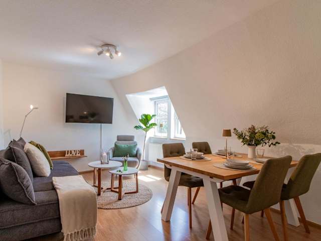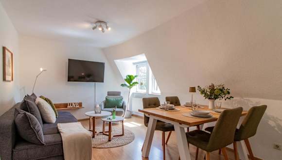 Die Ferienwohnung verfügt über ein Schlafzimmer, und eine komplett ausgestattete Küche mit Kühlschrank und Geschirrspüler. Ein Flachbild-TV sowie ein Sitzbereich sind ebenfalls vorhanden. Das Badezimmer ist mit einer Badewanne ausgestattet. Handtücher und Bettwäsche werden bereitgestellt.