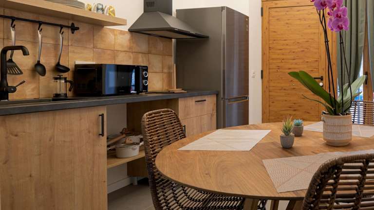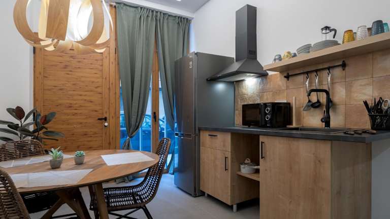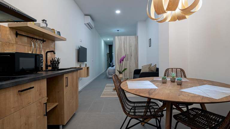 Die Studios sind mit Klimaanlage, kostenlosem WLAN, einer voll ausgestatteten Küche, einem Kühlschrank, einer Kaffeemaschine, einem TV und einem eigenen Badezimmer mit Dusche ausgestattet.