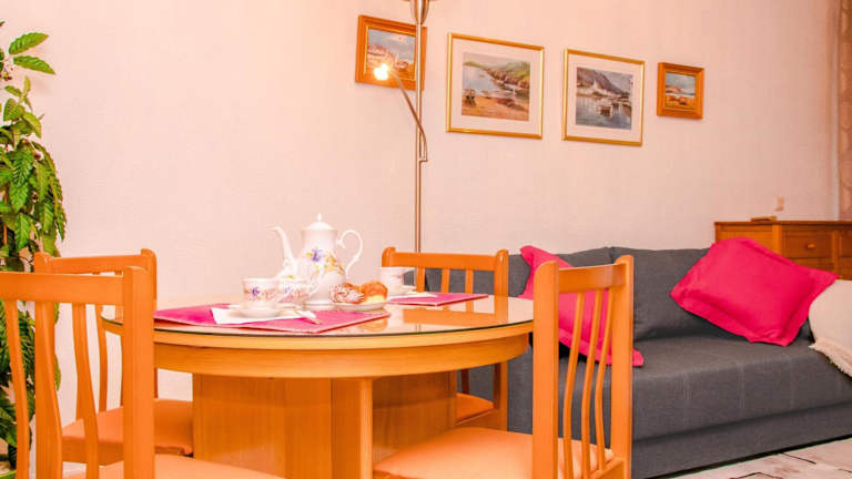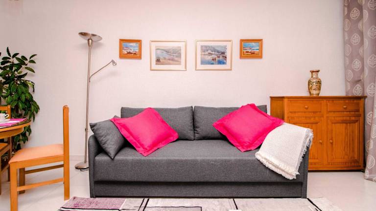 Die Ferienwohnung ist klimatisiert und umfasst ein Schlafzimmer sowie ein Wohnzimmer. Eine komplett ausgestattete Küche mit Kühlschrank und Wasserkocher ist vorhanden, ebenso ein Badezimmer mit Bidet und Dusche. Handtücher und Bettwäsche werden bereitgestellt. Die Unterkunft ist tierfreundlich, jedoch können Gebühren anfallen.