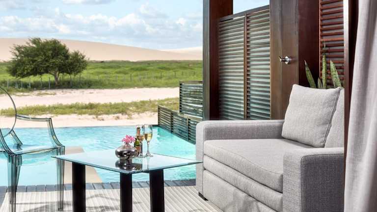 Das Essenza Dune Hotel in Jericoacoara ist eine ideale Wahl für einen erholsamen Urlaub. Die Lage des Hotels, nur 200 m vom Zentrum von Jericoacoara entfernt, ermöglicht es den Gästen, die umliegenden Sehenswürdigkeiten und den wunderschönen Strand von Jericoacoara bequem zu erkunden. Das Hotel bietet auch Zugang zu den Einrichtungen des Essenza Hotels, darunter ein Pool, ein Strandservice, eine Deck Bar, ein Spa und ein Fitnesscenter. Jedes Zimmer verfügt über einen eigenen Balkon mit einem Swimmingpool und einige Zimmer bieten einen gemütlichen Sitzbereich. Kostenloses WLAN und ein 24-Stunden-Rezeptionsservice stehen den Gästen zur Verfügung.