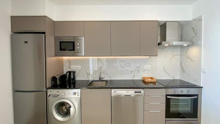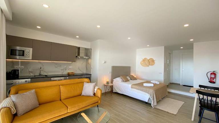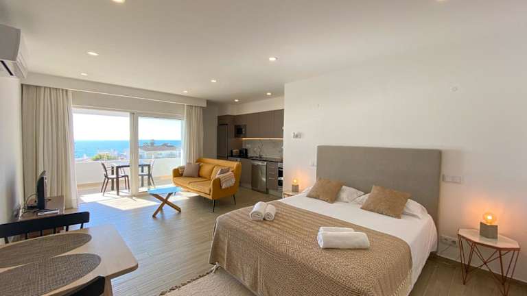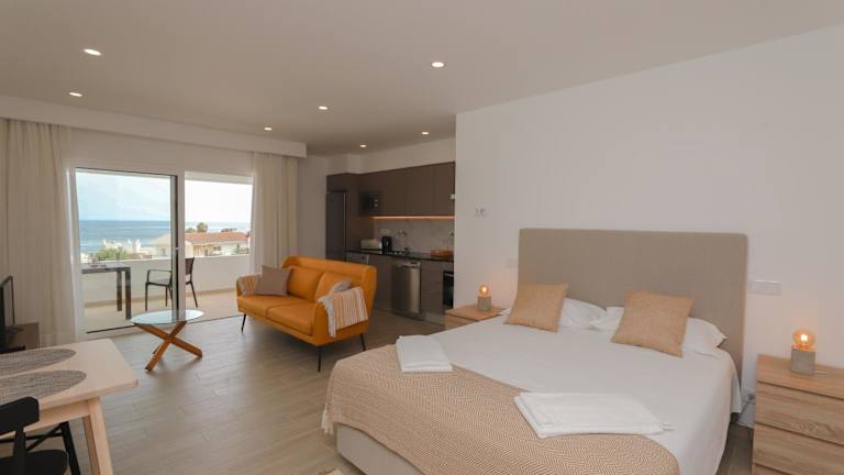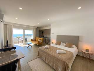 Das Studio ist mit 1 Schlafzimmer, 1 Badezimmer, Bettwäsche, Handtüchern, einem Flachbild-TV, einem Essbereich, einer voll ausgestatteten Küche und einem Balkon mit Meerblick ausgestattet.