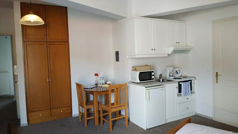 In den Eviali Apartments können die Gäste ihre eigenen Mahlzeiten zubereiten, da jede Unterkunft über eine voll ausgestattete Küchenzeile verfügt. Alternativ können Sie auch in den nahegelegenen Restaurants und Cafés lokale Spezialitäten genießen.