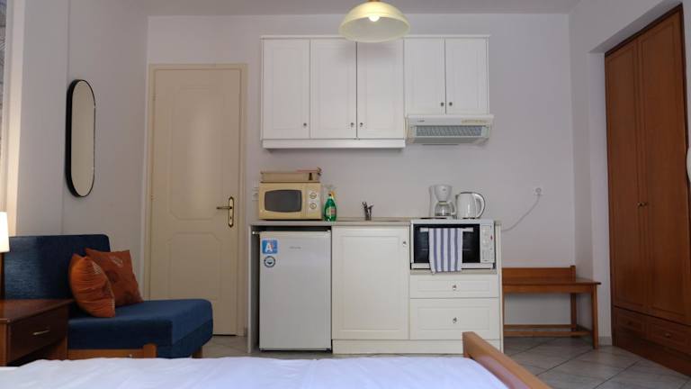 Jedes der Eviali Apartments ist mit einem Balkon ausgestattet, der einen herrlichen Ausblick bietet. Die Apartments verfügen über eine voll ausgestattete Küchenzeile mit einer Mikrowelle, einen gemütlichen Sitzbereich mit einem Schlafsofa, einen TV und ein eigenes Badezimmer mit einer Dusche und kostenlosen Pflegeprodukten. Ein Kühlschrank und ein Wasserkocher sind ebenfalls vorhanden, um den Gästen einen angenehmen Aufenthalt zu ermöglichen.
