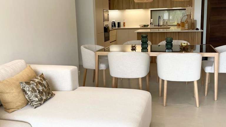 Die Ferienwohnung bietet 3 Schlafzimmer und 2 Badezimmer. Die Ausstattung umfasst Bettwäsche, Handtücher, einen Flachbild-TV, einen Essbereich sowie eine voll ausgestattete Küche. Eine Terrasse mit Meerblick ist ebenfalls vorhanden.