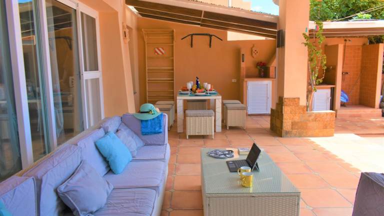 Die Villa verfügt über eine voll ausgestattete Küche, einen Essbereich sowie Grillmöglichkeiten im Garten.