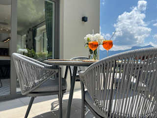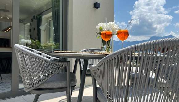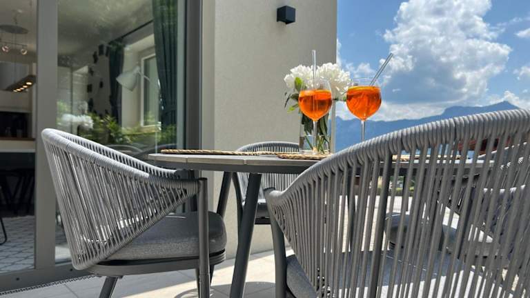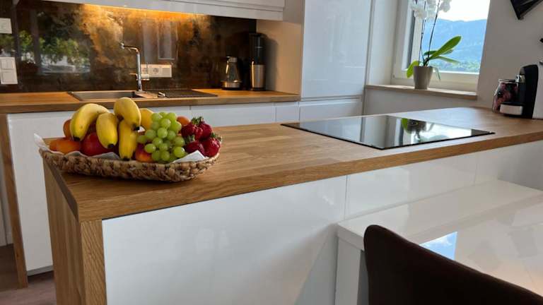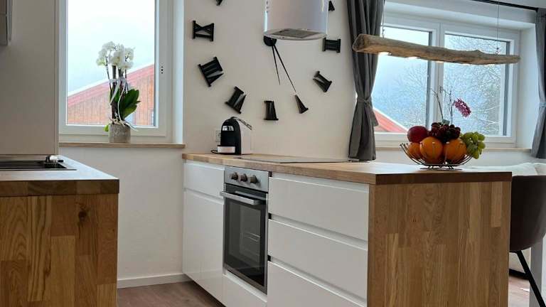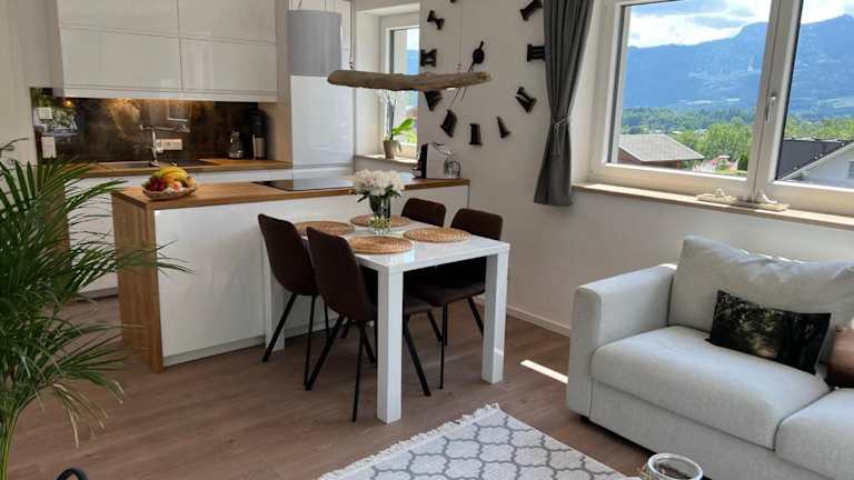 Die Ferienwohnung umfasst ein Schlafzimmer, ein Wohnzimmer, ein Badezimmer mit Dusche, eine gut ausgestattete Küche mit Kühlschrank und Geschirrspüler sowie eine Terrasse mit Bergblick. Handtücher und Bettwäsche werden bereitgestellt.