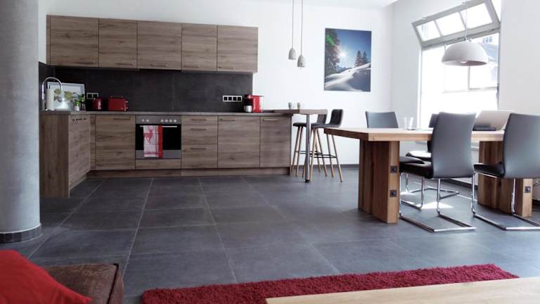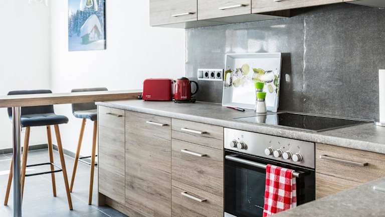 Die Ferienwohnung bietet eine voll ausgestattete Küche mit Kühlschrank, Geschirrspüler, Ofen, Mikrowelle, Herdplatte, Kaffeemaschine und Wasserkocher. Die Möglichkeit zur Selbstverpflegung wird somit gewährleistet.