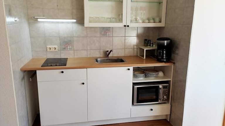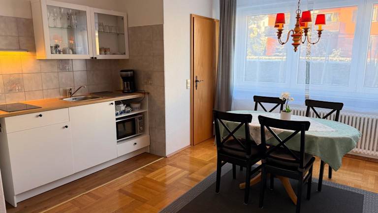Die Wohnung verfügt über eine voll ausgestattete Küche, die Annehmlichkeiten wie einen Kühlschrank und eine Kaffeemaschine umfasst. Essenslieferungen in die Unterkunft sind möglich. Ein weiterer Service ist der Waschsalon/Wäscheservice, der ebenfalls gegen Gebühr angeboten wird. Zu beachten ist, dass keine gemeinschaftlich genutzten Schreibwaren wie gedruckte Speisekarten zur Verfügung stehen und in der Unterkunft alle Teller und Bestecke desinfiziert wurden.