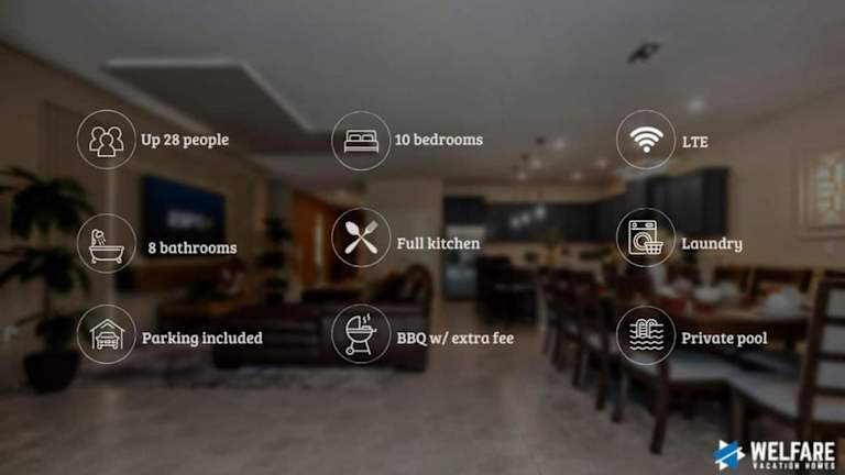 Exquisite, Brand New 10BR8BA for Up to 28 Guests bietet eine großzügige Ferienhausunterkunft mit einem eigenen Pool und modernen Annehmlichkeiten. Die klimatisierte Unterkunft ist für bis zu 28 Gäste geeignet und verfügt über zahlreiche Einrichtungen, darunter einen Innenpool mit Whirlpool.