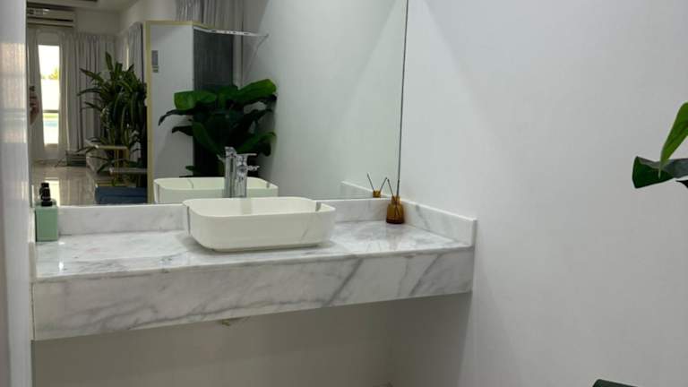 Das Ferienhaus bietet Platz in drei Schlafzimmern und einem Wohnzimmer. Es gibt eine voll ausgestattete Küche mit Kühlschrank und Wasserkocher sowie fünf Badezimmer mit Bidet und Dusche. Handtücher und Bettwäsche werden zur Verfügung gestellt.