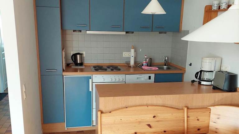 Die Ferienwohnung verfügt über ein Schlafzimmer, ein Wohnzimmer mit Flachbild-TV, eine gut ausgestattete Küchenzeile und ein Badezimmer mit Dusche und Haartrockner.
