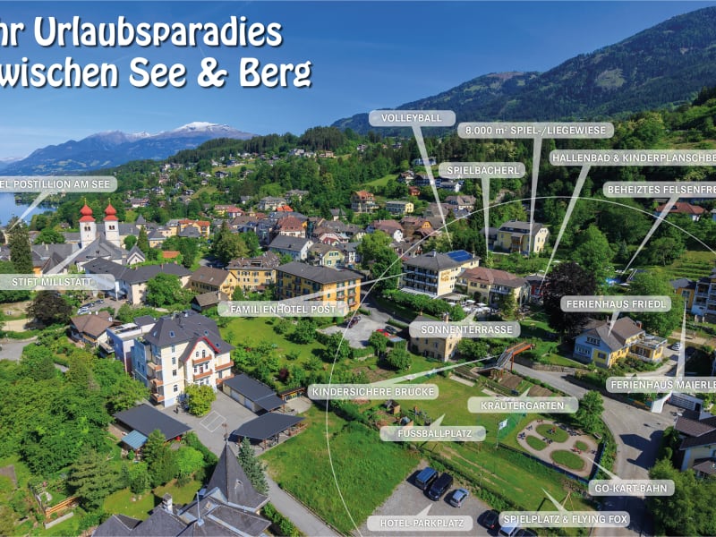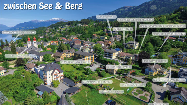 Im Ort Millstatt umgeben von Wiesen, auf der sonnigen Halbinsel am Millstättersee. im Sommer: wunderschöner, grosszügiger hoteleigener Badestrand direkt am See Winter: Vom Hotel sind 6 tolle Schigebiete in 35 Minuten erreichbar. winterlicher Zauberberg, Rodelpartien, Schneeschuhwanderungen....