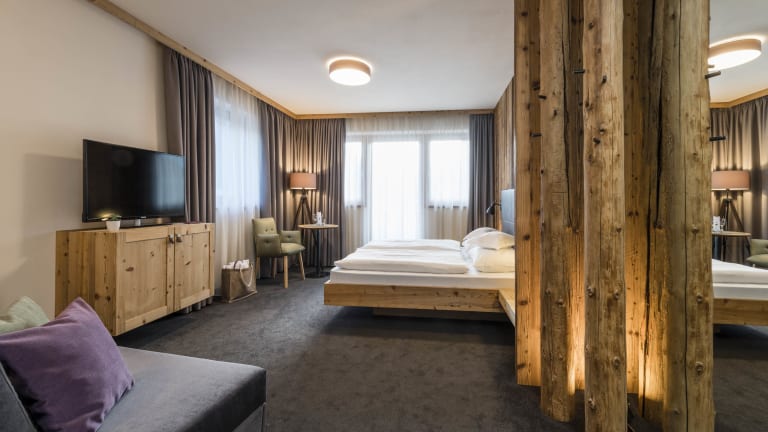 Entspannt und müde von der frischen Bergluft in gemütlichen Familienzimmern einschlafen Unsere hellen Zimmer sind ausgestattet mit Doppelbett, Sofa ausziehbar als Kinderbett, Badezimmer mit Dusche, WC, Fön und Schemel für die Kleinen, Balkon mit Talblick, Wellnesstasche mit Bademantel, Badehandtuch und Pantoffeln, TV, Telefon, Safe, Wanderrucksack, WLAN. Für die Kleinen: Wickelauflage, geschlossener Windeleimer, nach Bedarf: Baby-Phone, Babybadewanne, Töpfchen, Flaschenwärmer; Kostenloser Verleih: Kinderwagen, Rückentrage