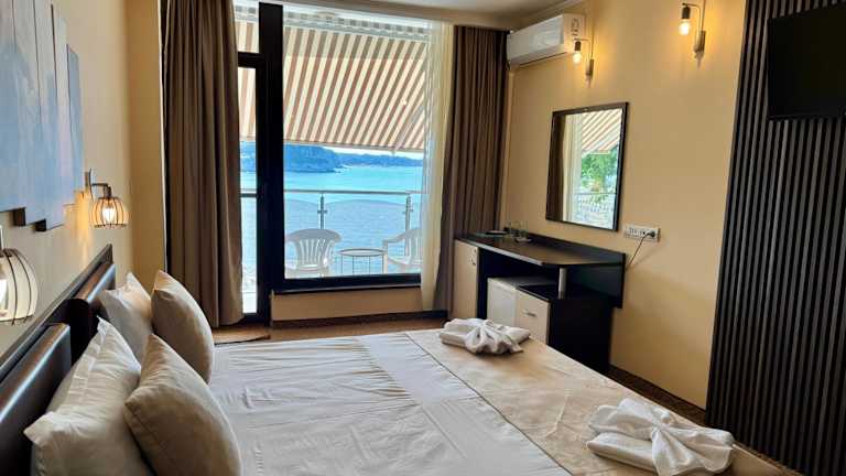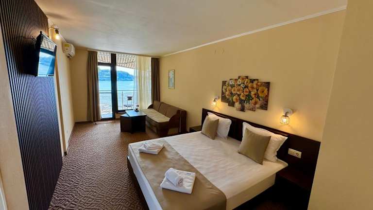 Das Family Hotel Teos liegt direkt neben dem Strand und nur 500 m vom Zentrum von Kiten entfernt. Die Lage ist ideal für alle, die das Meer und den Strand genießen möchten. In der Nähe gibt es auch verschiedene Restaurants, Bars und Geschäfte. Die Stadt Primorsko ist nur 5 km entfernt und kann leicht mit dem Bus erreicht werden. Eine Bushaltestelle ist nur 800 m vom Hotel entfernt.
