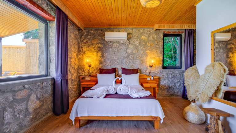 Jedes Zimmer in der Faralya Yoruk Evi Suite ist ausgestattet mit einem Balkon mit Poolblick, einem Wasserkocher sowie einem eigenen Badezimmer mit Dusche und kostenlosen Pflegeprodukten. Einige Zimmer verfügen über eine Küchenzeile mit Kühlschrank. Alle Zimmer sind klimatisiert und mit einem Schreibtisch ausgestattet.