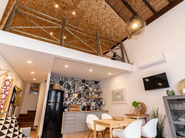 Die Wohneinheiten sind mit einer voll ausgestatteten Küche ausgestattet, die einen Kühlschrank, einen Geschirrspüler, eine Mikrowelle, eine Herdplatte, eine Kaffeemaschine und einen Wasserkocher umfasst. Ein Essbereich ist ebenfalls vorhanden.