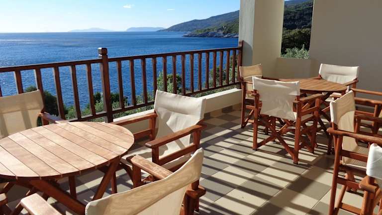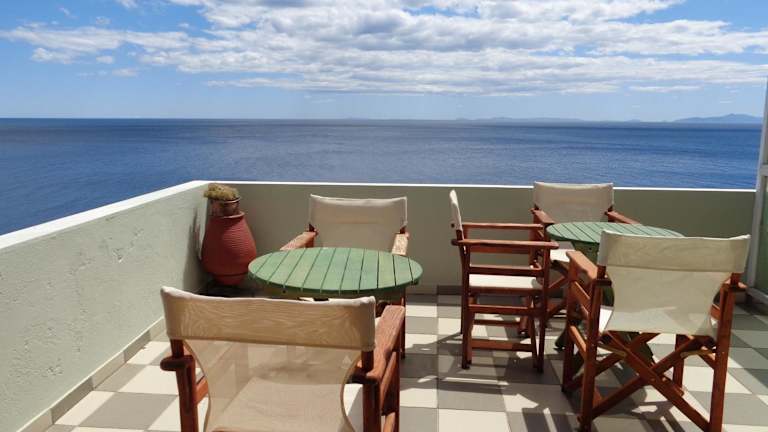 Jedes Zimmer in der Unterkunft Faros ist mit einer Klimaanlage, einem Schreibtisch, einem Flachbild-TV, einem eigenen Badezimmer, Bettwäsche, Handtüchern und einer Terrasse mit Meerblick ausgestattet. Darüber hinaus verfügen die Gästezimmer über einen Kühlschrank.