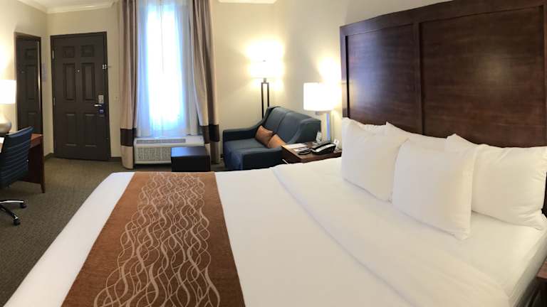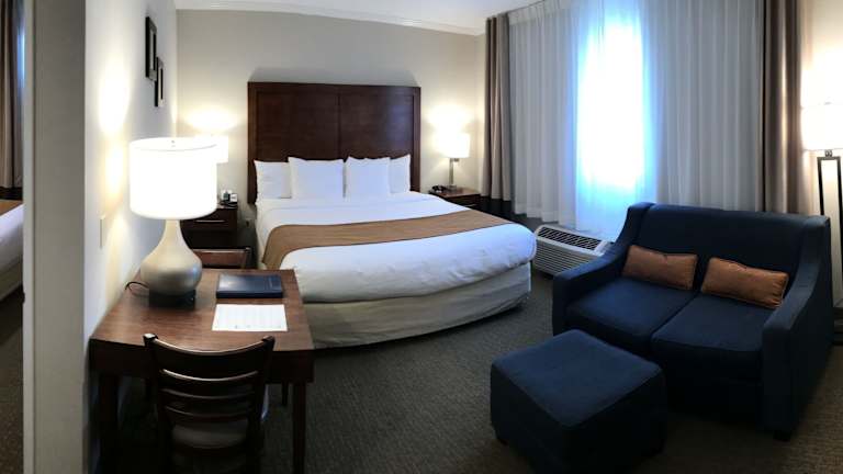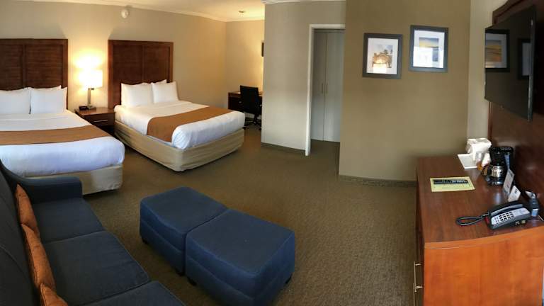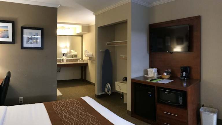 Alle Zimmer im Comfort Inn Santa Monica - West Los Angeles sind mit Annehmlichkeiten wie einem Kühlschrank, einer Mikrowelle, einem Bügeleisen/-brett, einem Safe und einem Haartrockner ausgestattet. Die Zimmer bieten Komfort und Bequemlichkeit für Reisende, die einen angenehmen Aufenthalt in Los Angeles suchen. Der Terrassenbereich des Hotels lädt zum Entspannen ein und bietet eine schöne Aussicht auf die Umgebung.