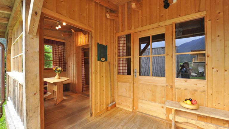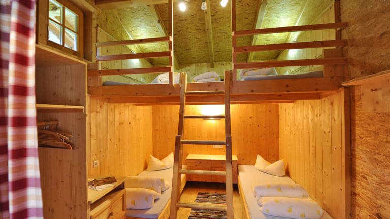 Adventure Hütten aus Holz in Zeltform für 2 - 4 Personen mit Ablage oder Mehrbettlager für 4-5 Personen mit Matratzen Polster und Decken. Die Sanitärbereiche (Damen und Herren getrennt) sind nebenan im Campgelände.