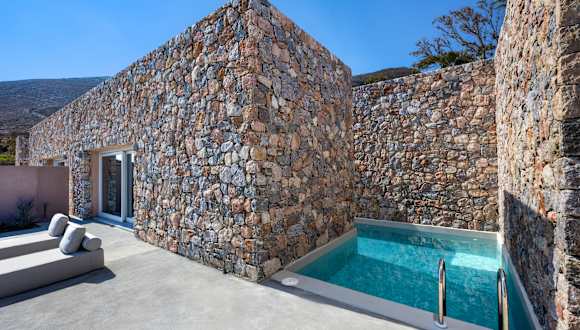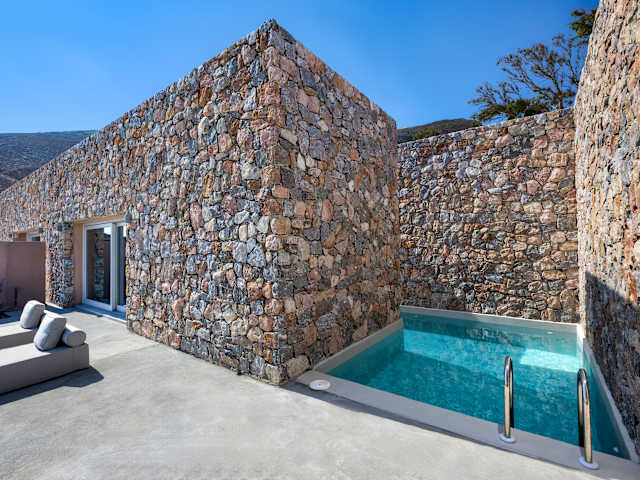 Willkommen in unserer neu eröffneten Unterkunft! Ruhiger Rückzugsort in den Hügeln Abseits der ausgetretenen Pfade gelegen, bieten wir Ruhe und Privatsphäre. Genießen Sie die Gelassenheit inmitten beruhigender Landschaften und der Schönheit der Natur. Private Pools mit Unterwasserfenstern Mit verspielten Unterwasserfenstern bieten diese Pools eine einzigartige Möglichkeit zur Entspannung, während Sie schimmernde Reflexionen und ein erfrischendes Ambiente genießen. Weitläufige Terrassen & Panoramablick Geräumige 100 qm große Terrassen mit Panoramablick auf das Meer, die Berge, entfernte Inseln und charmante Dörfer auf Hügeln oder verstreut in der Ebene. Steingebaute Suiten | Rustikale Eleganz Aus lokalem Naturstein gefertigt, fügen sie sich nahtlos in die natürliche Umgebung ein. Im Inneren bieten elegante Einrichtungen hochwertige Möbel und beruhigende Dekoration. Familienerbe-Wanderwege & Lokale Erlebnisse Folgen Sie uralten Pfaden direkt vor unserer Haustür entlang von Routen, die unsere Familie seit Generationen gewandelt ist. Entdecken Sie die Sankt-Georgs-Kirche, die von unserem Urgroßvater erbaut wurde und dramatisch am Berghang thront. Setzen Sie Ihren Weg fort vorbei am Steinbruch, aus dem die Steine unserer Villa stammen, durch das malerische Dorf Pyrgos bis hinauf zum Gipfel des Profitis-Ilias-Klosters. In der Nähe bieten Weltklasse-Weingüter Verkostungen von Santorinis berühmten Weinen nur wenige Minuten von Ihrer Villa entfernt.