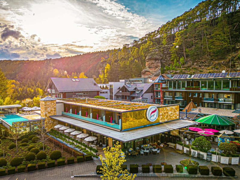 Natur, Ruhe, Wellness, Genuss... Das Wellness Hotel Felsenland in Dahn als Ihr Urlaubsziel ist ein ganz außergewöhnlicher Platz. Ein Wohlfühlort, an dem sich Ankommen nach einem herzlichen Willkommen und Wiederkehren nach Heimat anfühlen. Unser Wellnessbereich, der FelsenSpa ist ein Refugium für Körper, Geist und Seele. Die über 4.000 m² große Wellness- und Spawelt mit den 4 Pools, unserer abwechslungsreichen Aquawelt, sorgt für einzigartiges Spa-Vergnügen im Felsenland. Ganz neu: Unser XXL-Infinitypool, der größte Hotelpool in Rheinland-Pfalz. Das Felsenland Resort ist ein energetischer Kosmos für erlebnisreiche Momente und eine ganz wunderbare Zeit mit ganz viel Wohligem. Egal, ob beim ersten Besuch oder nach etlichen Jahren. Das Felsenland ist ein Ort, so bodenständig und sympathisch wie die Gastgeber selbst. Felsenland ist ein Ort, um Ihnen und ihrer Gesundheit Gutes zu tun. Das Hotel Felsenland in Dahn/Pfalz steht für ein Gefühl, einen Spirit, den das Haus in jedem Winkel zu atmen scheint. The Spirit of Felsenland. Felsenland steht für Lachen & Liebe, für Schönheit & Schönes. Erleben Sie Genuss & Geschmack. Und erleben Sie faszinierende Entdeckungen und viele interessante Begegnungen. Unsere Inklusivleistungen – Wohlfühlpaket Es sind die besonderen Augenblicke, an die man sich nach dem Urlaub zurückerinnert. Wir möchten Ihnen jeden Tag neue Wohlfühlmomente bereiten, die Ihnen ein Lächeln ins Gesicht zaubern. Alle Preise immer inklusive Wohlfühlpaket. ... für die Sinne Seccoempfang beim Check-In im Felsenland Resort Reichhaltiges, ausgewogenes Frühstücksbuffet von 07:30 bis 10:00 Uhr in unseren Felsenland Restaurants Mittagslunch-Buffet am Mittag von 12:30 bis 14:30 Uhr mit gesunden, leichten Vorspeisen, kleinen Snacks, Salatbuffet und warmen Gerichten im FelsenGraf Nachmittagskaffee mit frischem selbstgebackenem Kuchen von unserem Hausbäcker mit Tee- und Kaffeespezialitäten, frischem Felsenland-Quellwasser, Obst und Säften Abendessen in unseren Felsenland-Restaurants können Sie zwischen 18:00 bis 20:00 Uhr, in unserem FelsenGraf Steakhouse von 17:00 bis 20:30 Uhr. Im Steakhouse ist ein Gericht nach Wahl inkludiert, für exklusive Steak-Spezialitäten kann einen Aufpreis möglich sein. Täglich ab 14:00 Uhr Tee und frisches Obst an der Poolbar Ganztägig Felsenland-Quellwasser im gesamten Wellnessbereich ... fürs Wohlbefinden Entdecken Sie auf 4.000 m² die ganze Wellness-Vielfalt des Felsen-SPA: Spanoramasauna Bergsauna Lady-Spa-Sauna Infrarot-Höhle Harmoniedampfbad Salz-Bergwerk Bio-Sauna Farblicht-Sauna Poolsauna Panorama-Sauna Innenpool (29°C) Onsenbad (36°C) Cabrio-Pool (26°C) XXL-Infinity-Pool (28°C / 22m) Kneipp-Naturwasserpfad Schwallduschen Pool-Inseln mit Meeresrauschen Wellnessgarten Silence-Ruheraum beim Innenpool Stilles Plateau Relax-Lounge Pooldeck Dachterrasse Sonnendeck 21 Zauberwald-Ruheraum Yogaraum Fithouse-Gym Beauty-Wartebereich Teebar und vieles andere mehr ... Bild: Fürs Wohlbefinden ... für Lust auf Bewegung Entdecken Sie die einzigartige Natur des Dahner Felsenlands und steigern Sie Ihr Wohlbefinden in frischer Luft: Geführte Wanderungen Geführte E-Mountainbiketouren Geführte Mountainbiketouren Fahrrad- & Mountainbike-Verleih im Nachbarort (gegen Gebühr) Kostenloser Verleih von Nordic Walking und Wander-Stöcken und vieles andere mehr ... Bild: Für Lust auf Bewegung ... weil es nützlich ist stehen ihnen viele Annehmlichkeiten zur freien Nutzung zur Verfügung und wenn es Ihnen gefällt, können Sie Einiges davon bei uns erwerben: Bademantel Föhn Babybett, Wickelauflage, Windeleimer Wasserkocher Regenschirm Wanderrucksack an der Rezeption Bibliothek WLAN in allen Zimmern, Restaurants, Lobby, Bar und großen Teilen des Wellnessbereichs Etwas zu Hause vergessen, kleine Freuden für die Lieben zu Hause, all das finden Sie in unserer Boutique bei der Lobby Bild: Weil es nützlich ist ... einfach nur so Die einzigartige Atmosphäre, das unvergleichliche Ambiente in unserem Felsenland Resort und die Herzlichkeit unseres Felsenland Teams!
