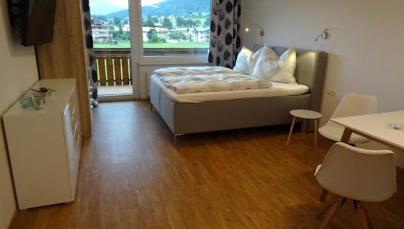 Das Appartement verfügt über ein Schlafzimmer und ein Badezimmer. Zur Ausstattung gehören Bettwäsche, Handtücher, ein Flachbild-TV mit Satellitenkanälen, ein Essbereich sowie eine voll ausgestattete Küchenzeile. Ein Balkon bietet einen Blick auf die Berge.