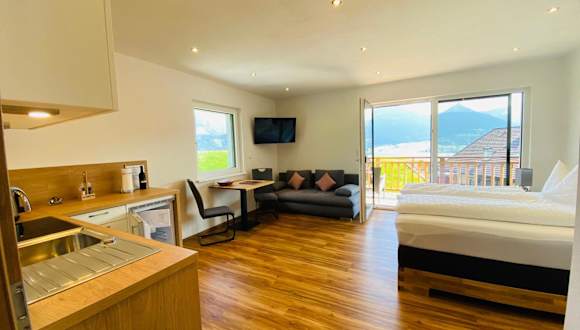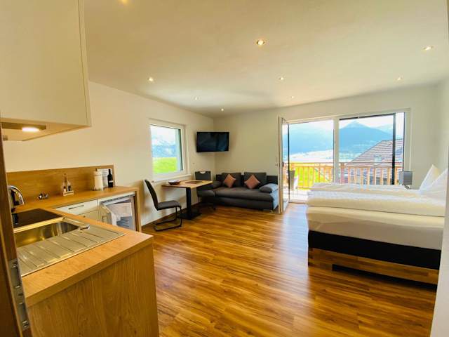 Die Ferienwohnung verfügt über 1 Schlafzimmer, 2 Badezimmer, Bettwäsche, Handtücher und einen Flachbild-TV mit Satellitenkanälen. Zudem ist eine voll ausgestattete Küche vorhanden, sowie ein Balkon mit Blick auf die Berge.