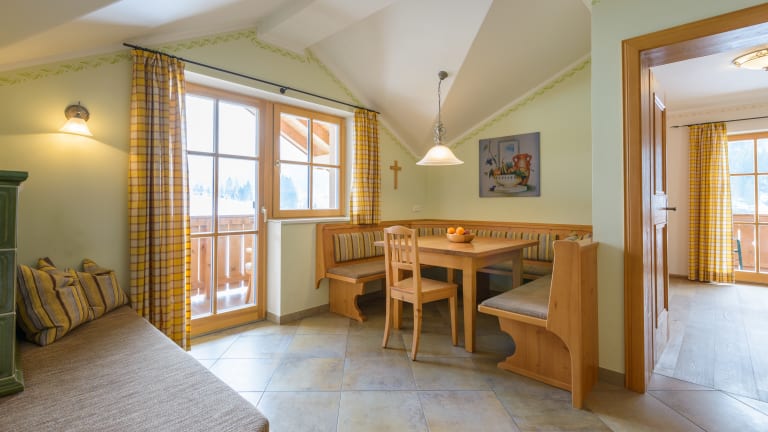 Ferienwohnungen, in denen sie sich vom ersten Moment an wohl fühlen: Vollholzmöbel, Dielenböden, Bodenheizung, teilw. beheizter Kachelofen, Balkon mit Aussicht in die Kleinarler Bergwelt beste Ausstattung in allen Wohnungen: * Bettwäsche, Hand-, Bade- und Geschirrtücher * Kabel-TV * W-Lan * Geschirrspüler * Kühlschrank mit Gefrierfach * Wasserkocher * Kaffeemaschine * E-Herd mit Backrohr * Bad mit Haarfön * Hochstuhl und Babybetten