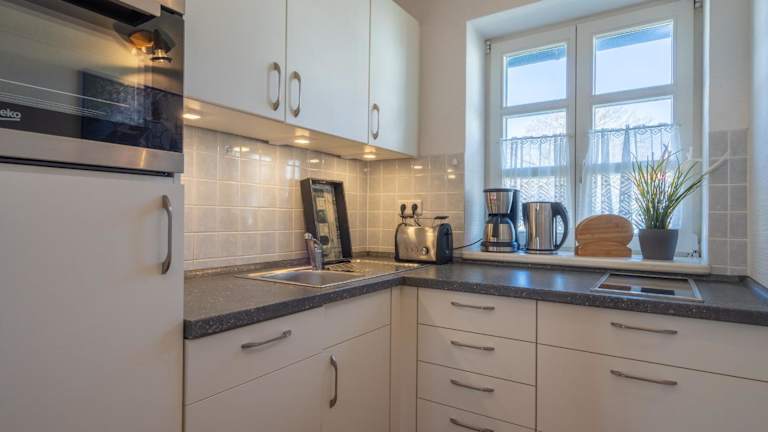 Die Wohnung umfasst zwei Schlafzimmer, ein Wohnzimmer und eine gut ausgestattete Küche, die mit einem Kühlschrank und einem Geschirrspüler ausgestattet ist. Handtücher und Bettwäsche werden bereitgestellt.