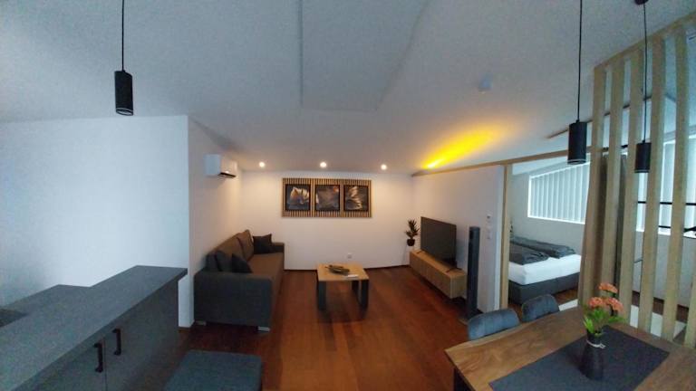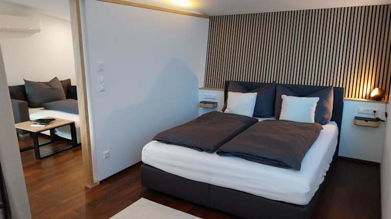 Die Ferienwohnung ist klimatisiert und umfasst ein Schlafzimmer sowie ein Wohnzimmer. Eine voll ausgestattete Küche mit Kühlschrank und Kaffeemaschine ist ebenfalls vorhanden. Das Badezimmer ist mit einer Dusche ausgestattet. Handtücher und Bettwäsche werden bereitgestellt. Zur Ausstattung gehören ebenfalls eine Terrasse und ein kostenloser Privatparkplatz.