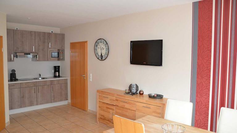 Die Ferienwohnungen im Ferienhaus am Maiglöchchenberg 5 sind mit einem Balkon, einem Sitzbereich und einem Flachbild-TV ausgestattet. Die Küchenzeile bietet eine Mikrowelle und eine voll ausgestattete Kochgelegenheit. Zudem verfügt jede Wohnung über ein eigenes Badezimmer mit Dusche und Haartrockner. Handtücher und Bettwäsche müssen selbst mitgebracht oder gegen Gebühr ausgeliehen werden.