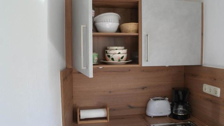 Es liegt eine voll ausgestattete Küche im Ferienhaus vor, die eine Küchenzeile mit Kühlschrank und Kaffeemaschine umfasst. Es sind keine weiteren Verpflegungsmöglichkeiten beschrieben.
