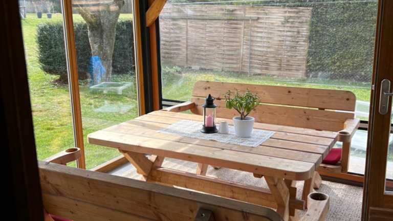 Die Ferienwohnung verfügt über ein Schlafzimmer, ein Badezimmer, einen Essbereich, eine voll ausgestattete Küche und eine Terrasse mit Gartenblick. Zur Ausstattung gehören Bettwäsche, Handtücher und ein Flachbild-TV.