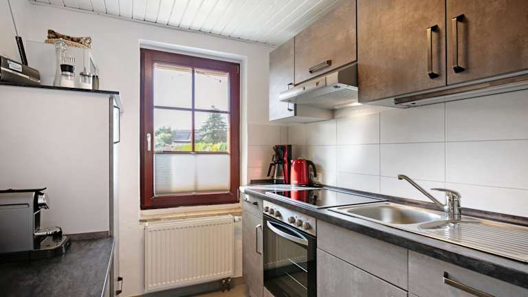Das Ferienhaus umfasst eine voll ausgestattete Küche mit Kühlschrank und Kaffeemaschine, in der Gäste ihre eigenen Mahlzeiten zubereiten können.