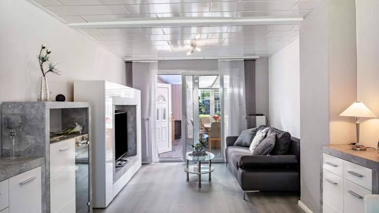 Das Ferienhaus beinhaltet zwei Schlafzimmer, ein Wohnzimmer sowie eine gut ausgestattete Küche. Es verfügt über zwei Badezimmer mit Dusche und Badewanne. Die Ausstattung umfasst zudem einen Satellitenfernseher. Handtücher und Bettwäsche werden bereitgestellt. Es gibt eine Terrasse mit Gartenblick.