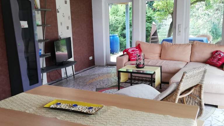 Das Ferienhaus im Grünen bietet Übernachtungsmöglichkeiten in einer ruhigen und naturnahen Umgebung. Es verfügt über einen Garten und eine Terrasse, die den Gästen eine entspannende Atmosphäre bietet. Zur Ausstattung gehören WLAN und kostenlose Parkmöglichkeiten.