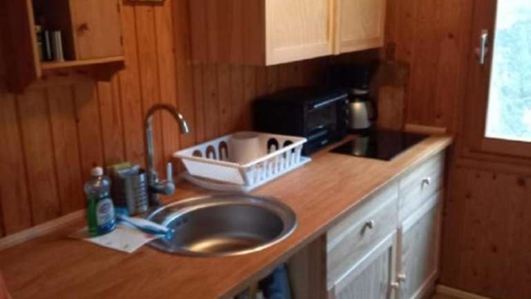 In der voll ausgestatteten Küche des Ferienhauses sind ein Kühlschrank und eine Kaffeemaschine vorhanden, die Selbstverpflegung ermöglichen.