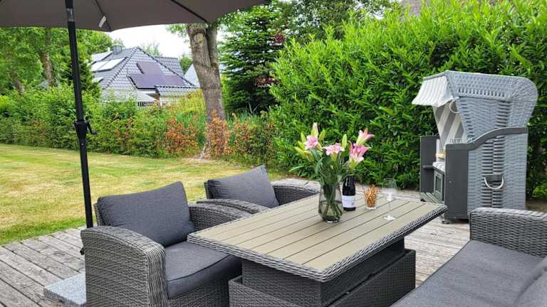 Das Ferienhaus 'Lachmöwe' ist mit einer Terrasse ausgestattet und bietet Übernachtungsmöglichkeiten. Die Unterkunft bietet kostenfreies WLAN und einen Blick in den Garten.