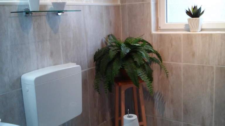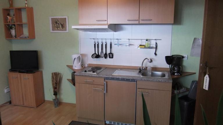 Die Unterkunft verfügt über eine voll ausgestattete Küchenzeile mit Kühlschrank, Ofen, Herdplatte, Toaster, Kaffeemaschine und Wasserkocher, was eine Selbstversorgung ermöglicht.