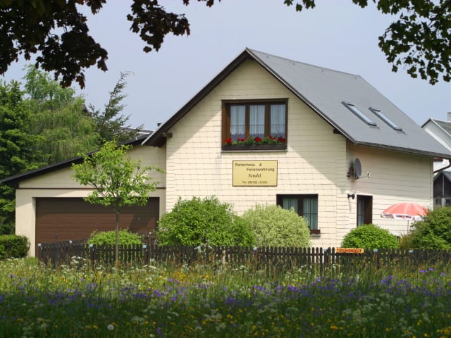 Mitten im Thüringer Wald, etwa 800 Meter hoch und direkt am Rennsteig, liegt Frauenwald. Hierher laden wir Sie ein zum Erholen! Für Ihren Urlaub stehen Ihnen in zentraler und ruhiger Lage zwei Ferienhäuser und eine Ferienwohnung, umgeben von einem großen Garten, zur Verfügung. Zu all unseren Unterkünften gehört eine Terrasse mit Gartenmöbeln und Grillmöglichkeit. Selbstverständlich kann sich auch Ihr Auto gleich neben Ihrem Domizil erholen. Romantische Wanderwege und Skiloipen beginnen etwa 200 Meter hinter dem Haus. Vergnügliche Ferientage in unseren attraktiven und komfortablen Ferienhäusern - eine individuelle Alternative zum Hotelurlaub. Sie genießen erlebnisreiche Ferien mit dem "eigenen Schlüssel", frei und unbeschwert. Der gewünschte Komfort ist Ihnen dabei sicher. Erholen Sie sich auf der Sonnenterrasse, wandern Sie durch die grünen Wälder, fahren Sie Ski auf den langen Loipen rund um Frauenwald ..., den Möglichkeiten werden keine Grenzen gesetzt. Vergessen Sie Stress und Hektik! Wir werden Ihnen dabei gern behilflich sein.