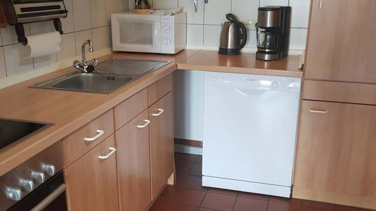 Die Küchenzeile des Ferienhauses ist mit einem Kühlschrank, einem Geschirrspüler, einem Ofen, einer Kaffeemaschine und einem Wasserkocher ausgestattet.