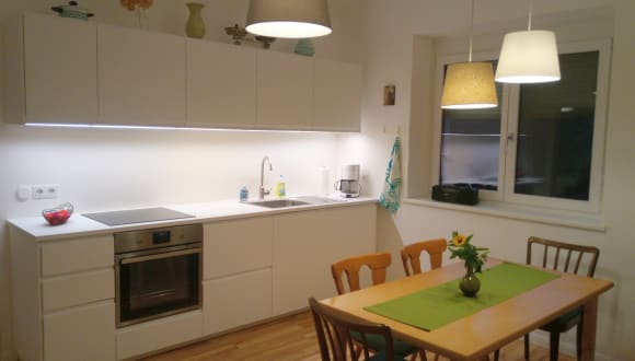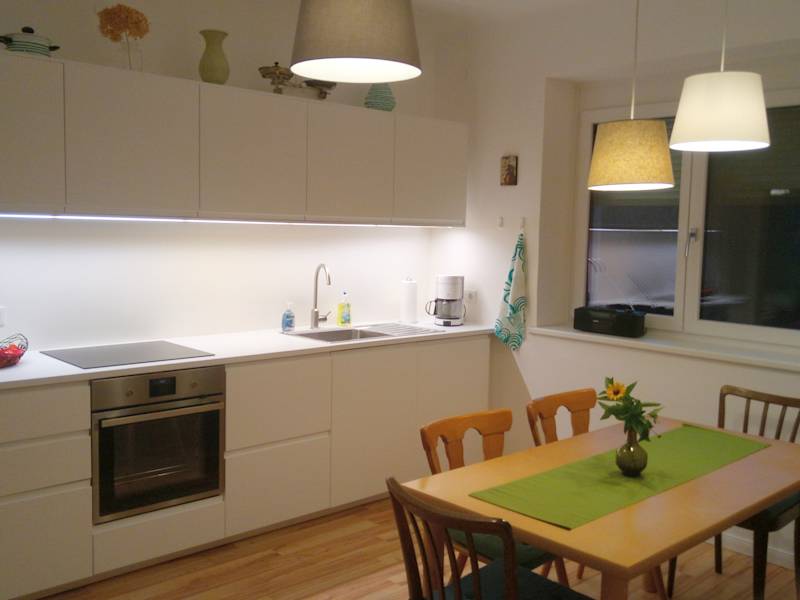 Selbstversorger-Küche * Tisch mit 6 Sitzplätzen * Kühlschrank, Spüle, Herd mit Ceranfeld und Backofen * Mikrowelle, Kaffeemaschine, Wasserkocher und Toaster * Geschirr und Besteck, Weingläser, Biergläser, Schüsseln, Töpfe, Pfannen und Kochutensilien * Kinderhochstuhl, Kindergeschirr und Plastikbecher * Spülmittel, Spülschwämme und Geschirrtücher, Küchenrolle, Servietten und Kaffeefilter * Küchenmesser, Schäler, Flaschenöffner, Korkenzieher ... * Kaffee und Tee, Zucker, Salz und Pfeffer, Gewürze * Haustier-Futterschüsseln
