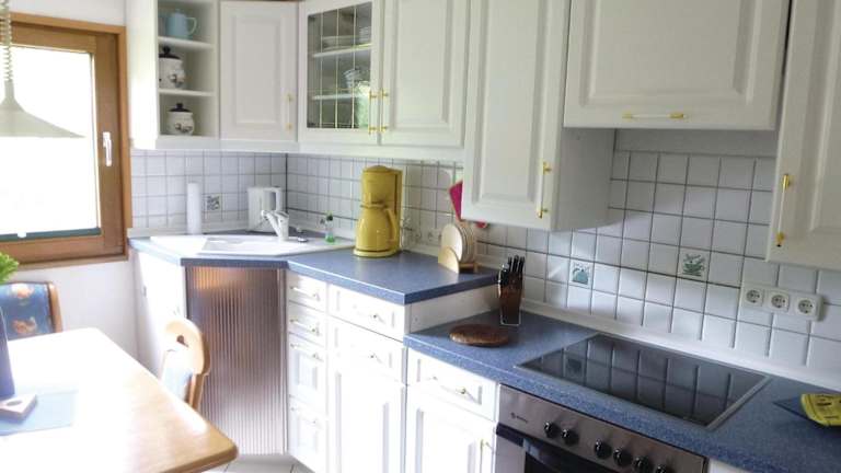 Das Ferienhaus bietet ein Schlafzimmer, ein Badezimmer mit Dusche und ein Wohnzimmer. Die Ausstattung umfasst eine gut eingerichtete Küche mit Kühlschrank und Geschirrspüler sowie einen Balkon mit Bergblick.