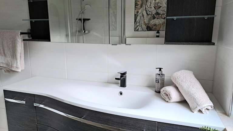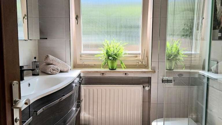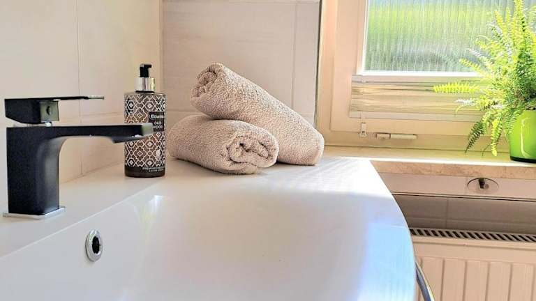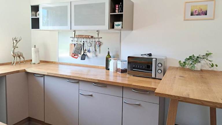 Das Ferienhaus bietet ein Schlafzimmer und ist ausgestattet mit einer modernen Küche, einem Badezimmer mit Dusche, sowie Handtüchern und Bettwäsche.