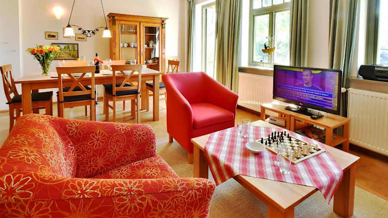 Verbringen Sie Ihren Urlaub im Ferienhaus Strandperlen Sanddornhof 7b (Typ VI) in Wustrow und genießen Sie den Komfort eines gut ausgestatteten Hauses mit kostenfreiem WLAN und einem schönen Gartenblick. Die Unterkunft befindet sich nur 300 m vom Strand Wustrow entfernt und bietet kostenfreie Privatparkplätze. Mit einer Terrasse, 2 Schlafzimmern, einem gemütlichen Wohnzimmer und einer gut ausgestatteten Küche bietet das Ferienhaus alles, was Sie für einen entspannten Aufenthalt benötigen. Sat-TV und ein CD-Player sorgen für Unterhaltung. Entdecken Sie auch den Strand Ahrenshoop, der nur 2,2 km entfernt liegt, oder besuchen Sie den Yachthafen Warnemünde, der 38 km entfernt ist. Der nächstgelegene Flughafen Rostock-Laage ist 59 km entfernt.