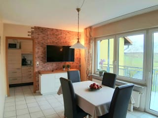 Umgeben von Wiesen und Feldern liegt die Ferienwohnung idyllisch und ruhig, abseits vom Straßenverkehr. Großer Kinderfuhrpark, Spielplatz, überdachtes Riesentrampolin, Indoor-Spielbereich mit Vorgelnestschaukel.