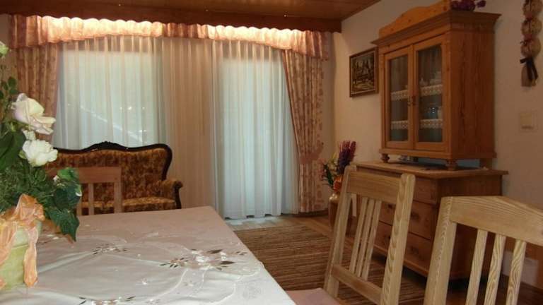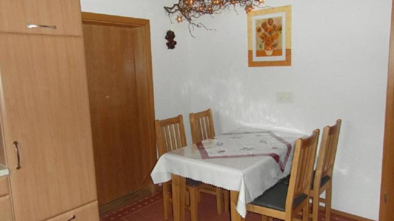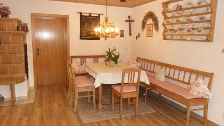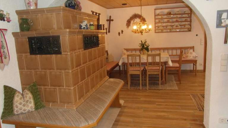 Das Apartment verfügt über einen Balkon und einen traditionellen Kachelofen mit einem gemütlichen Sitzbereich. Die Einrichtung umfasst eine gut ausgestattete Küche mit einem Geschirrspüler und ein eigenes Badezimmer. Ein Flachbild-Sat-TV sorgt für Unterhaltung.