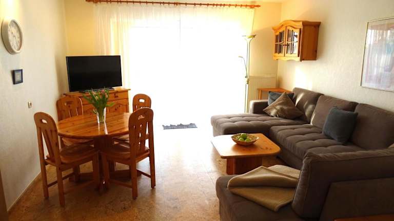 Die Ferienwohnung umfasst eine Küchenzeile mit einem Kühlschrank und einem Geschirrspüler, was Ihnen eine Selbstversorgung ermöglicht.