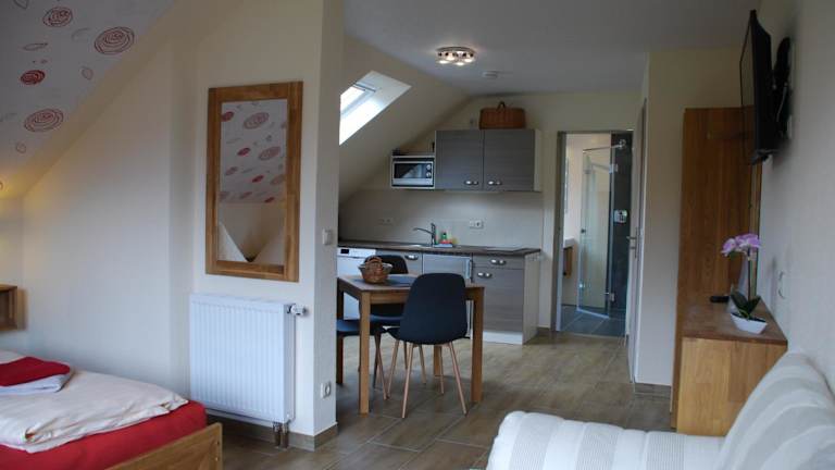 Das Apartment in der Ferienoase Hinterhermsdorf bietet einen herrlichen Blick auf die umliegenden Berge und ist mit einer Terrasse ausgestattet, auf der Sie entspannen und die Natur genießen können. Im Inneren erwartet Sie ein gemütlicher Sitzbereich und ein Flachbild-Sat-TV für Unterhaltung. Die voll ausgestattete Küche bietet alles, was Sie für die Zubereitung Ihrer Mahlzeiten benötigen, darunter ein Kühlschrank, eine Mikrowelle, ein Kochfeld, ein Toaster, eine Kaffeemaschine und ein Wasserkocher. Das private Badezimmer verfügt über eine Dusche.